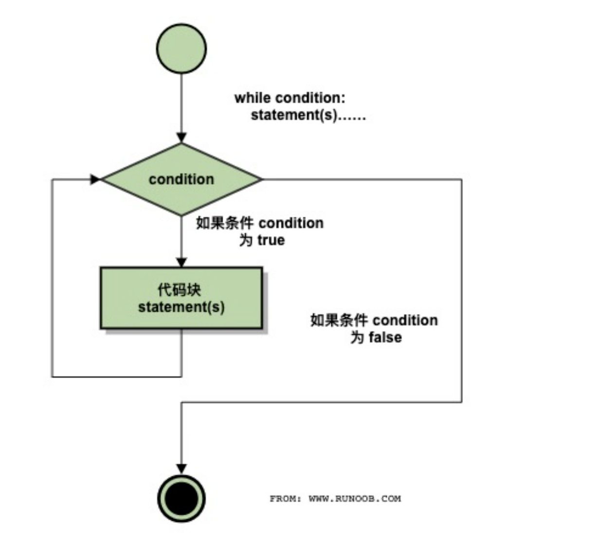 ## While 循环语句 ``` while 判断条件(condition): 执行语句(statements)…… ``` 执行语句可以是单个语句或语句块。判断条件可以是任何表达式,任何非零、或非空(null)的值均为true。 当判断条件假 false 时,循环结束。 执行流程图如下:   ### 循环使用 else 语句 ```python #!/usr/bin/python count = 0 while count < 5: print count, " is less than 5" count = count + 1 else: print count, " is not less than 5" #输出结果 0 is less than 5 1 is less than 5 2 is less than 5 3 is less than 5 4 is less than 5 5 is not less than 5 ``` ## for 循环语句 Python for循环可以遍历任何序列的项目,如一个列表或者一个字符串。 语法: for循环的语法格式如下: ``` for iterating_var in sequence: statements(s) ``` ``` str1="python" for s in str1: print("forec: "+s) # forec: p forec: y forec: t forec: h forec: o forec: n # list1= [23,445,324,5567,345] for num in list1: print("forec: " + str(num)) # forec: 23 forec: 445 forec: 324 forec: 5567 forec: 345 ``` ## Python break 语句 Python break语句,就像在C语言中,打破了最小封闭for或while循环。 break语句用来终止循环语句,即循环条件没有False条件或者序列还没被完全递归完,也会停止执行循环语句。 break语句用在while和for循环中。 如果您使用嵌套循环,break语句将停止执行最深层的循环,并开始执行下一行代码。  ``` #!/usr/bin/python # -*- coding: UTF-8 -*- for letter in 'Python': # 第一个实例 if letter == 'h': break print '当前字母 :', letter var = 10 # 第二个实例 while var > 0: print '当前变量值 :', var var = var -1 if var == 5: # 当变量 var 等于 5 时退出循环 break print "Good bye!" ``` ## Python continue 语句 Python continue 语句跳出本次循环,而break跳出整个循环。 continue 语句用来告诉Python跳过当前循环的剩余语句,然后继续进行下一轮循环。 continue语句用在while和for循环中。 Python 语言 continue 语句语法格式如下:  ``` #!/usr/bin/python # -*- coding: UTF-8 -*- for letter in 'Python': # 第一个实例 if letter == 'h': continue print '当前字母 :', letter var = 10 # 第二个实例 while var > 0: var = var -1 if var == 5: continue print '当前变量值 :', var print "Good bye!" ``` ## Python pass 语句 Python pass 是空语句,是为了保持程序结构的完整性。 pass 不做任何事情,一般用做占位语句。 Python 语言 pass 语句语法格式如下: ``` pass ``` pass 一般用于占位置。 在 Python 中有时候会看到一个 def 函数: ``` def sample(n_samples): pass ``` 该处的 pass 便是占据一个位置,因为如果定义一个空函数程序会报错,当你没有想好函数的内容是可以用 pass 填充,使程序可以正常运行。