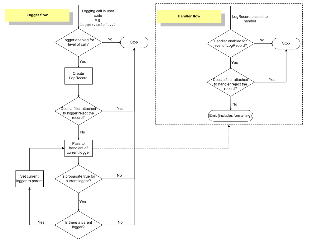 ## logging.basicConfig()函数说明 ``` import logging logging.basicConfig(filename='example.log', encoding='utf-8', level=logging.DEBUG) logging.debug('This message should go to the log file') logging.info('So should this') logging.warning('And this, too') logging.error('And non-ASCII stuff, too, like Øresund and Malmö') ``` 该方法用于为logging日志系统做一些基本配置,方法定义如下: ``` logging.basicConfig(**kwargs) ``` 该函数可接收的关键字参数如下: 参数名称 | 描述 * | - filename | 指定日志输出目标文件的文件名,指定该设置项后日志信心就不会被输出到控制台了 filemode | 指定日志文件的打开模式,默认为'a'。需要注意的是,该选项要在filename指定时才有效 format | 指定日志格式字符串,即指定日志输出时所包含的字段信息以及它们的顺序。logging模块定义的格式字段下面会列出。 datefmt | 指定日期/时间格式。需要注意的是,该选项要在format中包含时间字段%(asctime)s时才有效 level | 指定日志器的日志级别 stream | 指定日志输出目标stream,如sys.stdout、sys.stderr以及网络stream。需要说明的是,stream和filename不能同时提供,否则会引发 ValueError异常 style | Python 3.2中新添加的配置项。指定format格式字符串的风格,可取值为'%'、'{'和'$',默认为'%' handlers | Python 3.3中新添加的配置项。该选项如果被指定,它应该是一个创建了多个Handler的可迭代对象,这些handler将会被添加到root logger。需要说明的是:filename、stream和handlers这三个配置项只能有一个存在,不能同时出现2个或3个,否则会引发ValueError异常。 ## logging模块定义的格式字符串字段 我们来列举一下logging模块中定义好的可以用于format格式字符串中字段有哪些: 字段/属性名称 | 使用格式 | 描述 * | - | - asctime | %(asctime)s | 日志事件发生的时间--人类可读时间,如:2003-07-08 16:49:45,896 created | %(created)f | 日志事件发生的时间--时间戳,就是当时调用time.time()函数返回的值 relativeCreated | %(relativeCreated)d | 日志事件发生的时间相对于logging模块加载时间的相对毫秒数(目前还不知道干嘛用的) msecs | %(msecs)d | 日志事件发生事件的毫秒部分 levelname | %(levelname)s | 该日志记录的文字形式的日志级别('DEBUG', 'INFO', 'WARNING', 'ERROR', 'CRITICAL') levelno | %(levelno)s | 该日志记录的数字形式的日志级别(10, 20, 30, 40, 50) name | %(name)s | 所使用的日志器名称,默认是'root',因为默认使用的是 rootLogger message | %(message)s | 日志记录的文本内容,通过 msg % args计算得到的 pathname | %(pathname)s | 调用日志记录函数的源码文件的全路径 filename | %(filename)s | pathname的文件名部分,包含文件后缀 module | %(module)s | filename的名称部分,不包含后缀 lineno | %(lineno)d | 调用日志记录函数的源代码所在的行号 funcName | %(funcName)s | 调用日志记录函数的函数名 process | %(process)d | 进程ID processName | %(processName)s | 进程名称,Python 3.1新增 thread | %(thread)d | 线程ID threadName | %(thread)s | 线程名称 ## logging模块日志流处理流程 ### logging日志模块四大组件 在介绍logging模块的日志流处理流程之前,我们先来介绍下logging模块的四大组件: 组件名称 | 对应类名 | 功能描述 * | - | - 日志器 | Logger | 提供了应用程序可一直使用的接口 处理器 | Handler | 将logger创建的日志记录发送到合适的目的输出 过滤器 | Filter | 提供了更细粒度的控制工具来决定输出哪条日志记录,丢弃哪条日志记录 格式器 | Formatter | 决定日志记录的最终输出格式 logging模块就是通过这些组件来完成日志处理的,上面所使用的logging模块级别的函数也是通过这些组件对应的类来实现的。 这些组件之间的关系描述: * 日志器(logger)需要通过处理器(handler)将日志信息输出到目标位置,如:文件、sys.stdout、网络等; * 不同的处理器(handler)可以将日志输出到不同的位置; * 日志器(logger)可以设置多个处理器(handler)将同一条日志记录输出到不同的位置; * 每个处理器(handler)都可以设置自己的过滤器(filter)实现日志过滤,从而只保留感兴趣的日志; * 每个处理器(handler)都可以设置自己的格式器(formatter)实现同一条日志以不同的格式输出到不同的地方。 简单点说就是:日志器(logger)是入口,真正干活儿的是处理器(handler),处理器(handler)还可以通过过滤器(filter)和格式器(formatter)对要输出的日志内容做过滤和格式化等处理操作。 ### logging日志模块相关类及其常用方法介绍 下面介绍下与logging四大组件相关的类:Logger, Handler, Filter, Formatter。 #### Logger类 Logger对象有3个任务要做: 1)向应用程序代码暴露几个方法,使应用程序可以在运行时记录日志消息; 2)基于日志严重等级(默认的过滤设施)或filter对象来决定要对哪些日志进行后续处理; 3)将日志消息传送给所有感兴趣的日志handlers。 Logger对象最常用的方法分为两类:配置方法 和 消息发送方法 最常用的配置方法如下: 方法 | 描述 * | - Logger.setLevel() | 设置日志器将会处理的日志消息的最低严重级别 Logger.addHandler() 和 Logger.removeHandler() | 为该logger对象添加 和 移除一个handler对象 Logger.addFilter() 和 Logger.removeFilter() | 为该logger对象添加 和 移除一个filter对象 | 关于Logger.setLevel()方法的说明: 内建等级中,级别最低的是DEBUG,级别最高的是CRITICAL。例如setLevel(logging.INFO),此时函数参数为INFO,那么该logger将只会处理INFO、WARNING、ERROR和CRITICAL级别的日志,而DEBUG级别的消息将会被忽略/丢弃。 logger对象配置完成后,可以