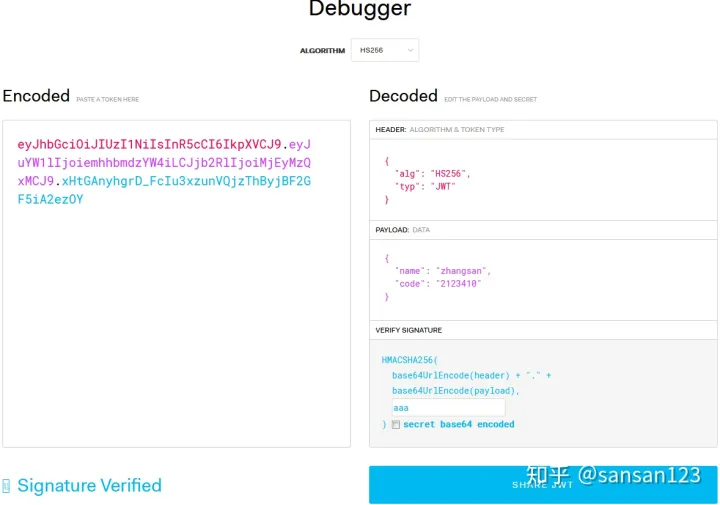 # 1. JSON Web Token是什么 JSON Web Token (JWT)是一个开放标准(RFC 7519),它定义了一种紧凑的、自包含的方式,用于作为JSON对象在各方之间安全地传输信息。该信息可以被验证和信任,因为它是数字签名的。 # 2. 什么时候你应该用JSON Web Token 下列场景中使用JSON Web Token是很有用的: * Authorization (授权) : 这是使用JWT的最常见场景。一旦用户登录,后续每个请求都将包含JWT,允许用户访问该令牌允许的路由、服务和资源。单点登录是现在广泛使用的JWT的一个特性,因为它的开销很小,并且可以轻松地跨域使用。 * Information Exchange (信息交换) : 对于安全的在各方之间传输信息而言,JSON Web Tokens无疑是一种很好的方式。因为JWT可以被签名,例如,用公钥/私钥对,你可以确定发送人就是它们所说的那个人。另外,由于签名是使用头和有效负载计算的,您还可以验证内容没有被篡改。 # 3. JSON Web Token的结构是什么样的 JSON Web Token由三部分组成,它们之间用圆点(.)连接。这三部分分别是: * Header * Payload * Signature 因此,一个典型的JWT看起来是这个样子的:  | xxxxx.yyyyy.zzzzz 接下来,具体看一下每一部分: * Header header典型的由两部分组成:token的类型(“JWT”)和算法名称(比如:HMAC SHA256或者RSA等等)。 例如: ``` { 'alg': "HS256", 'typ': "JWT" } ``` 然后,用Base64对这个JSON编码就得到JWT的第一部分 * Payload JWT的第二部分是payload,它包含声明(要求)。声明是关于实体(通常是用户)和其他数据的声明。声明有三种类型: registered, public 和 private。 * Registered claims : 这里有一组预定义的声明,它们不是强制的,但是推荐。比如:iss (issuer), exp (expiration time), sub (subject), aud (audience)等。 * Public claims : 可以随意定义。 * Private claims : 用于在同意使用它们的各方之间共享信息,并且不是注册的或公开的声明。 下面是一个例子: ``` { "sub": '1234567890', "name": 'john', "admin":true } ``` 对payload进行Base64编码就得到JWT的第二部分 注意,不要在JWT的payload或header中放置敏感信息,除非它们是加密的。 * Signature 为了得到签名部分,你必须有编码过的header、编码过的payload、一个秘钥,签名算法是header中指定的那个,然对它们签名即可。 例如: | HMACSHA256(base64UrlEncode(header) + "." + base64UrlEncode(payload), secret) 签名是用于验证消息在传递过程中有没有被更改,并且,对于使用私钥签名的token,它还可以验证JWT的发送方是否为它所称的发送方。 看一张官网的图就明白了:  # 4. JSON Web Tokens是如何工作的 在认证的时候,当用户用他们的凭证成功登录以后,一个JSON Web Token将会被返回。此后,token就是用户凭证了,你必须非常小心以防止出现安全问题。一般而言,你保存令牌的时候不应该超过你所需要它的时间。 无论何时用户想要访问受保护的路由或者资源的时候,用户代理(通常是浏览器)都应该带上JWT,典型的,通常放在Authorization header中,用Bearer schema。 header应该看起来是这样的: | Authorization: Bearer 服务器上的受保护的路由将会检查Authorization header中的JWT是否有效,如果有效,则用户可以访问受保护的资源。如果JWT包含足够多的必需的数据,那么就可以减少对某些操作的数据库查询的需要,尽管可能并不总是如此。 如果token是在授权头(Authorization header)中发送的,那么跨源资源共享(CORS)将不会成为问题,因为它不使用cookie。 # 5. 基于Token的身份认证 与 基于服务器的身份认证 ## 5.1 基于服务器的身份认证 在讨论基于Token的身份认证是如何工作的以及它的好处之前,我们先来看一下以前我们是怎么做的: HTTP协议是无状态的,也就是说,如果我们已经认证了一个用户,那么他下一次请求的时候,服务器不知道我是谁,我们必须再次认证 传统的做法是将已经认证过的用户信息存储在服务器上,比如Session。用户下次请求的时候带着Session ID,然后服务器以此检查用户是否认证过。 这种基于服务器的身份认证方式存在一些问题: Sessions : 每次用户认证通过以后,服务器需要创建一条记录保存用户信息,通常是在内存中,随着认证通过的用户越来越多,服务器的在这里的开销就会越来越大。 Scalability : 由于Session是在内存中的,这就带来一些扩展性的问题。 CORS : 当我们想要扩展我们的应用,让我们的数据被多个移动设备使用时,我们必须考虑跨资源共享问题。当使用AJAX调用从另一个域名下获取资源时,我们可能会遇到禁止请求的问题。 CSRF : 用户很容易受到CSRF攻击。 ## 5.2. JWT与Session的差异 相同点是,它们都是存储用户信息;然而,Session是在服务器端的,而JWT是在客户端的。 Session方式存储用户信息的最大问题在于要占用大量服务器内存,增加服务器的开销。 而JWT方式将用户状态分散到了客户端中,可以明显减轻服务端的内存压力。 Session的状态是存储在服务器端,客户端只有session id;而Token的状态是存储在客户端。  ## 5.3. 基于Token的身份认证是如何工作的 基于Token的身份认证是无状态的,服务器或者Session中不会存储任何用户信息。 没有会话信息意味着应用程序可以根据需要扩展和添加更多的机器,而不必担心用户登录的位置。 虽然这一实现可能会有所不同,但其主要流程如下: -用户携带用户名和密码请求访问 -服务器校验用户凭据 -应用提供一个token给客户端 -客户端存储token,并且在随后的每一次请求中都带着它 -服务器校验token并返回数据 注意: -每一次请求都需要token -Token应该放在请